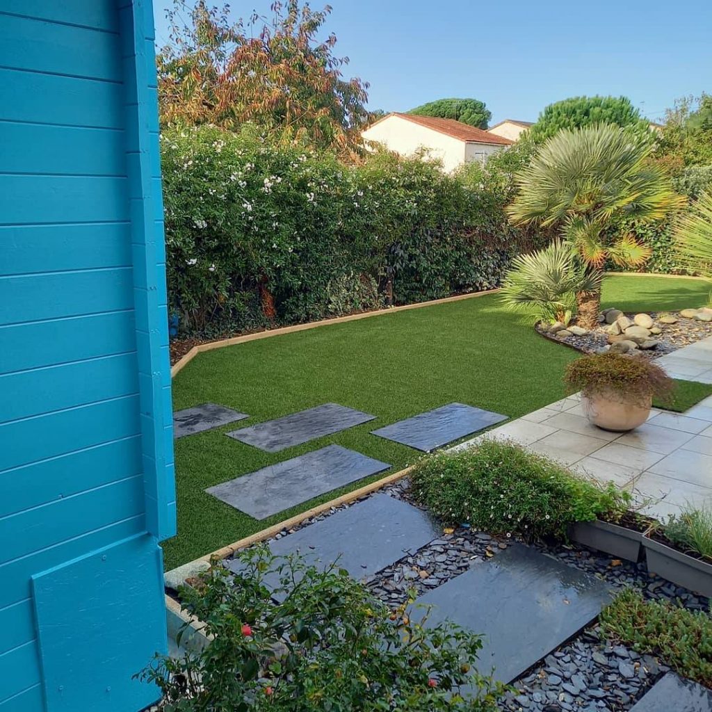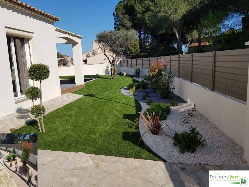 Création paysagère à Saint Jean de Védas dans l’Hérault en gazon synthétique Cette magnifique réalisation en est la preuve ! Cette création allie parfaitement plantation, graviers et gazon artificiel Nous r...