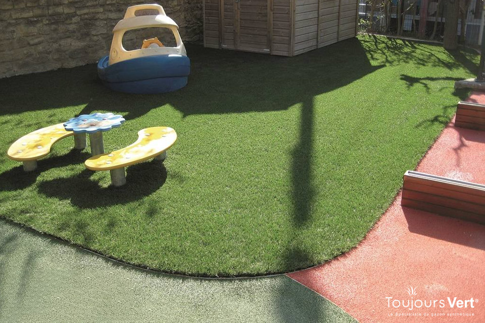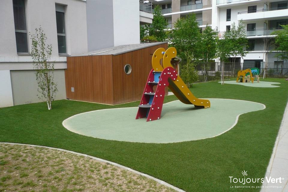 Sur cette aire de jeux privée, le Reality® ST 42 Traité Protecturf allie sécurité, confort et durabilité. Sa souplesse au sol et sa résistance aux usages quotidiens en font la solution idéale pour offrir aux enfants un espace de jeu agréable, propre et toujours vert, au cœur de la résidence.