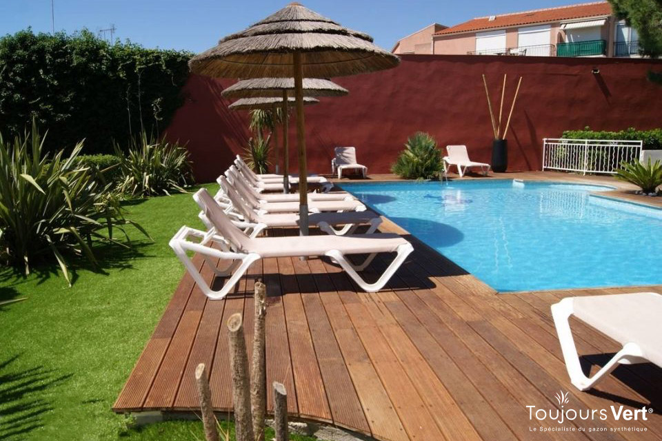 Autour de cette piscine, le gazon Reality® ST 42 Traité Protecturf apporte une touche de nature maîtrisée et un confort incomparable. Doux sous les pieds, drainant et résistant au chlore comme aux UV, il garantit une esthétique soignée et un entretien minimal pour un cadre toujours impeccable.